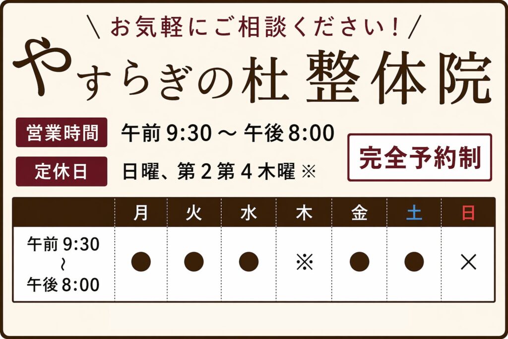 すべての施術が終わりましたら、お会計となります。必要に応じて整体の通院ペースや次回のご予約についてもご案内いたしますので、安心してご相談ください。
