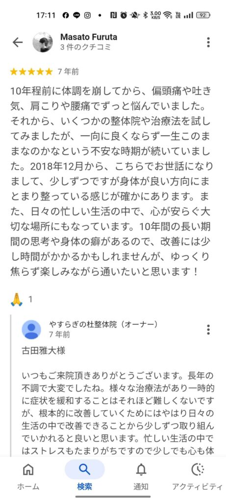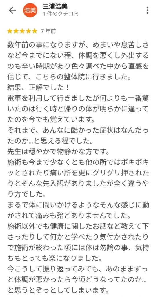 数年前、めまいや息苦しさで体調が悪化し外出も辛い時期があり、直感でこの整体院に通い始めました。結果的に体調が劇的に改善し、施術後には体が明らかに軽くなったことを覚えています。先生の穏やかな対応と、痛みを伴わない優しい施術方法が印象的でした。(抜粋)