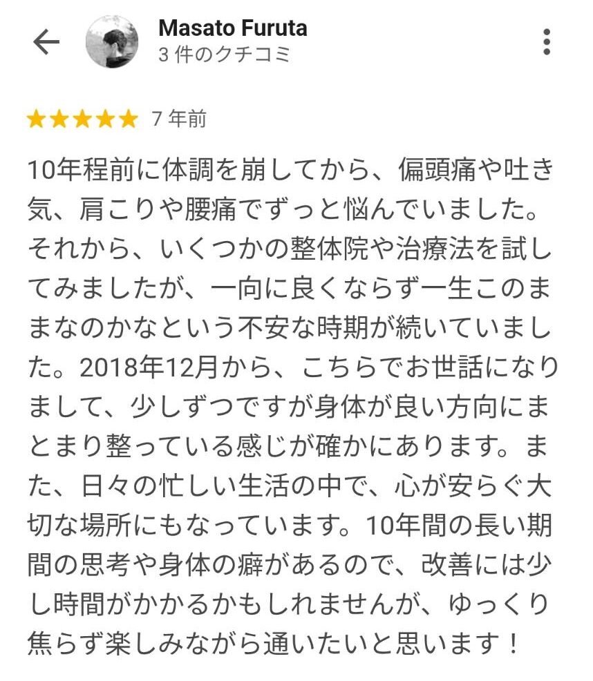 だるい感じや疲れが取れず、整体は、こちらが初めてでした。身体も心も整えてくださる感じがします。最初は長く続けるつもりはありませんでしたが、今は自分が良いことを体験が出来、周りにも勧めています。施術後は、自分の身体をよく知ることができ、調子も良くなります。(要約)