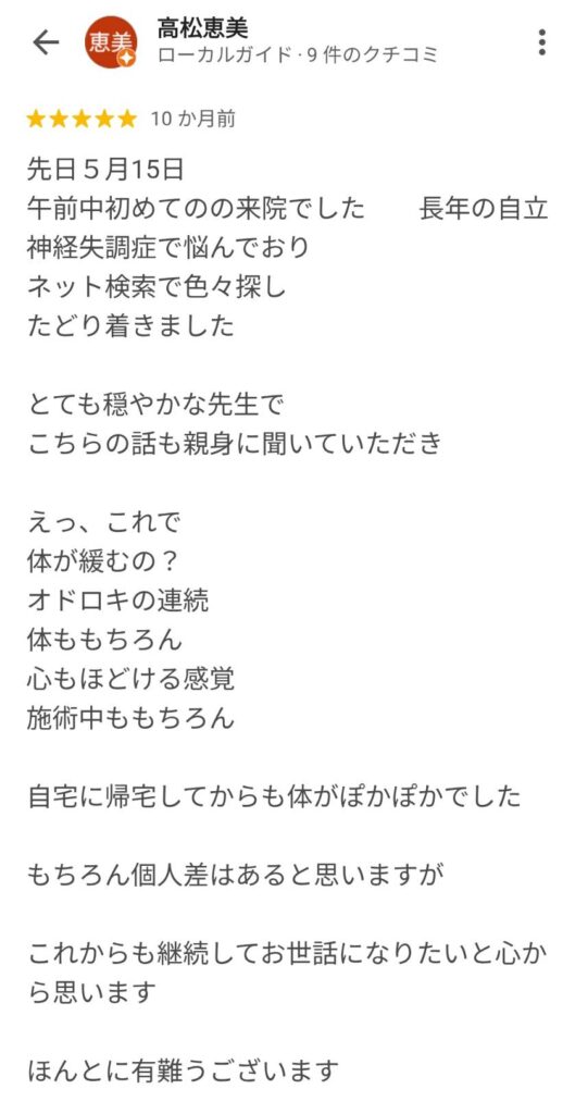 長年自律神経失調症で悩んでおりネット検索で色々探しだどり着きました。とても穏やかな先生でこちらの話も親身に聞いていただき、えっこれで緩むの?驚きの連続。体ももちろん心もほどける感覚。施術中ももちろん自宅に帰宅してからも身体がぽかぽかでした。(抜粋)