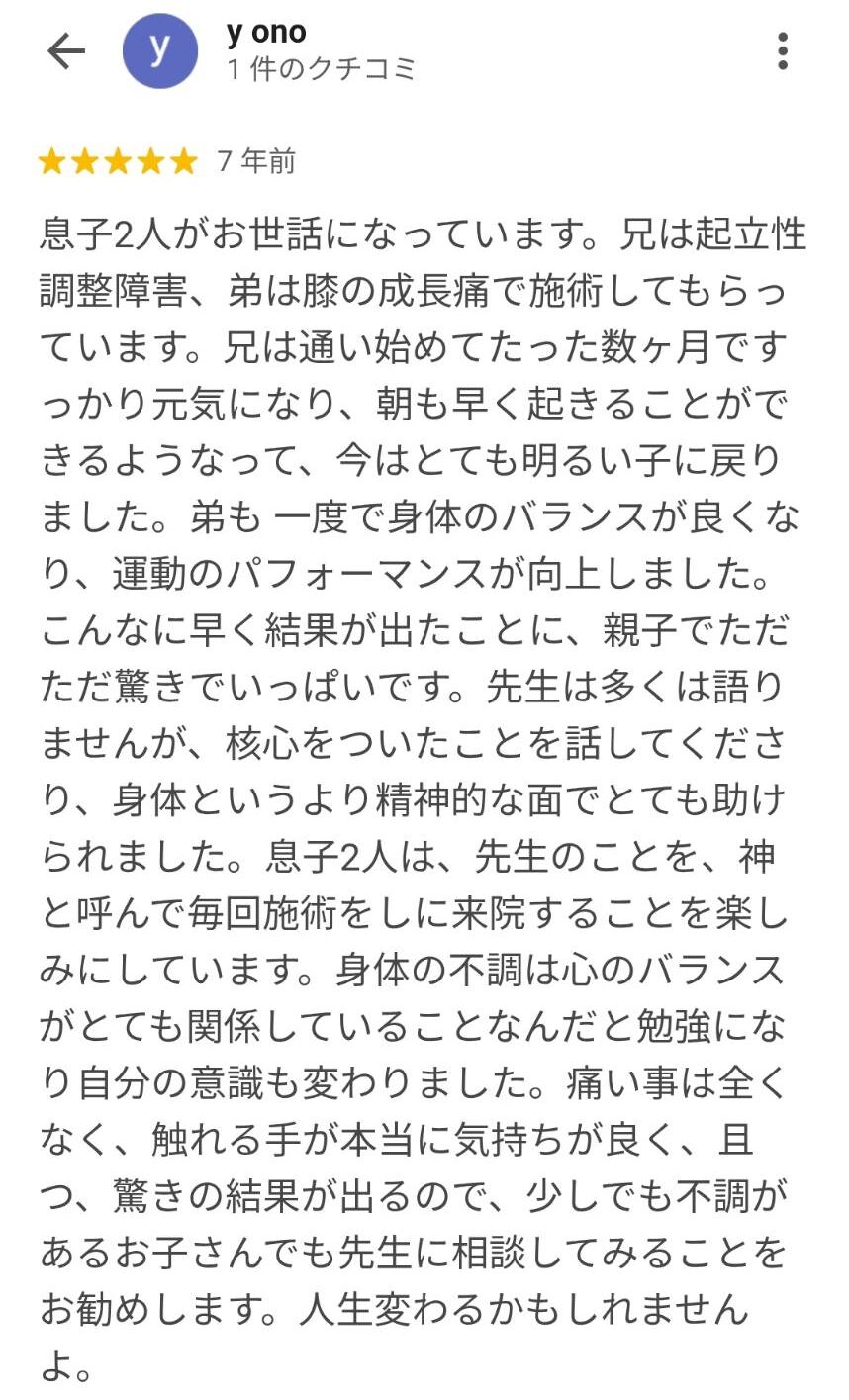 息子2人がお世話になっています。兄は起立性調節障害、弟は膝の成長痛で施術してもらっています。兄は通い始めてたった数ヶ月ですっかり元気になり、朝も早く起きることができるようになって、今はとても明るい子に戻りました。先生は多くを語りませんが、核心をついたことを話してくださり、身体というより精神的な面でとても助けられました。息子2人は、先生のことを神と呼んで毎回施術しに来院することを楽しみにしています。(要約)